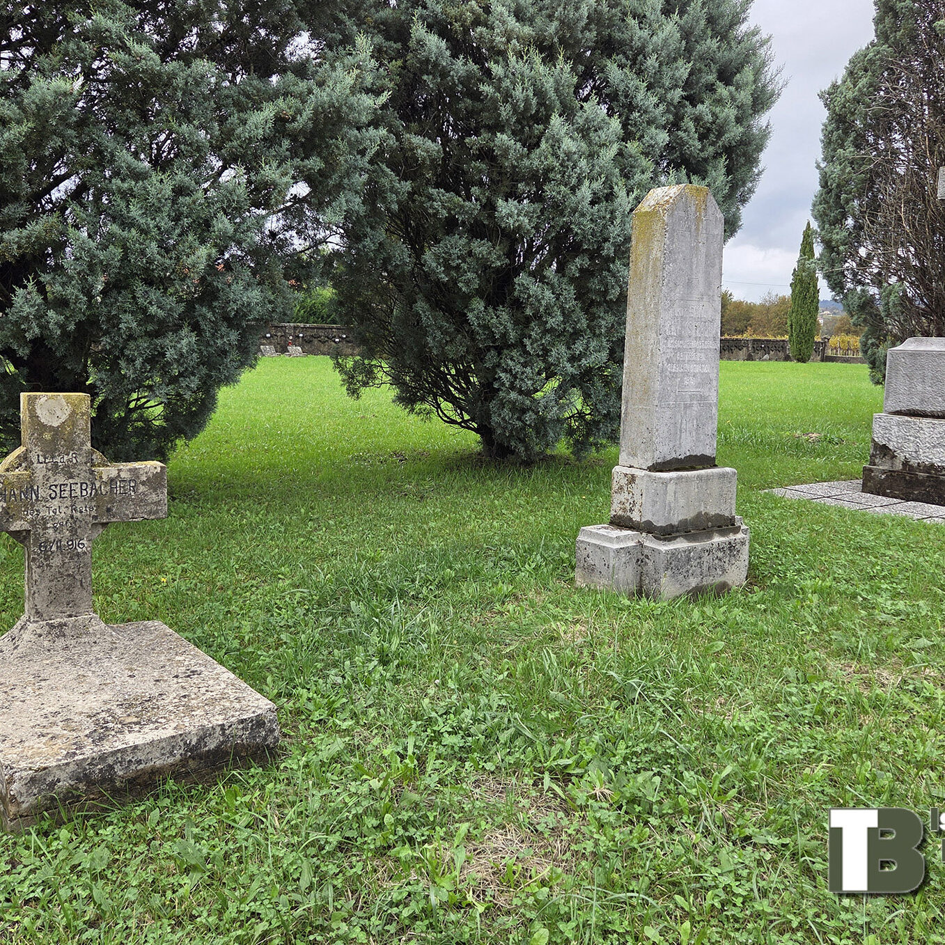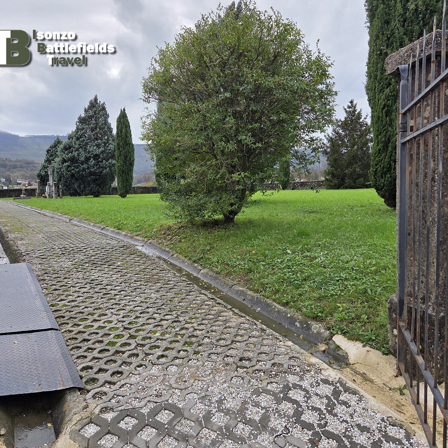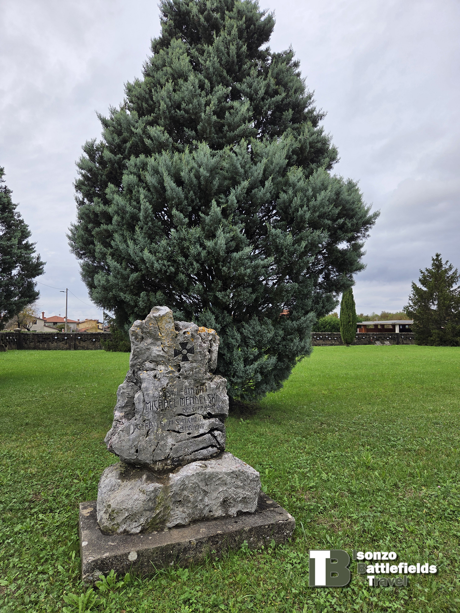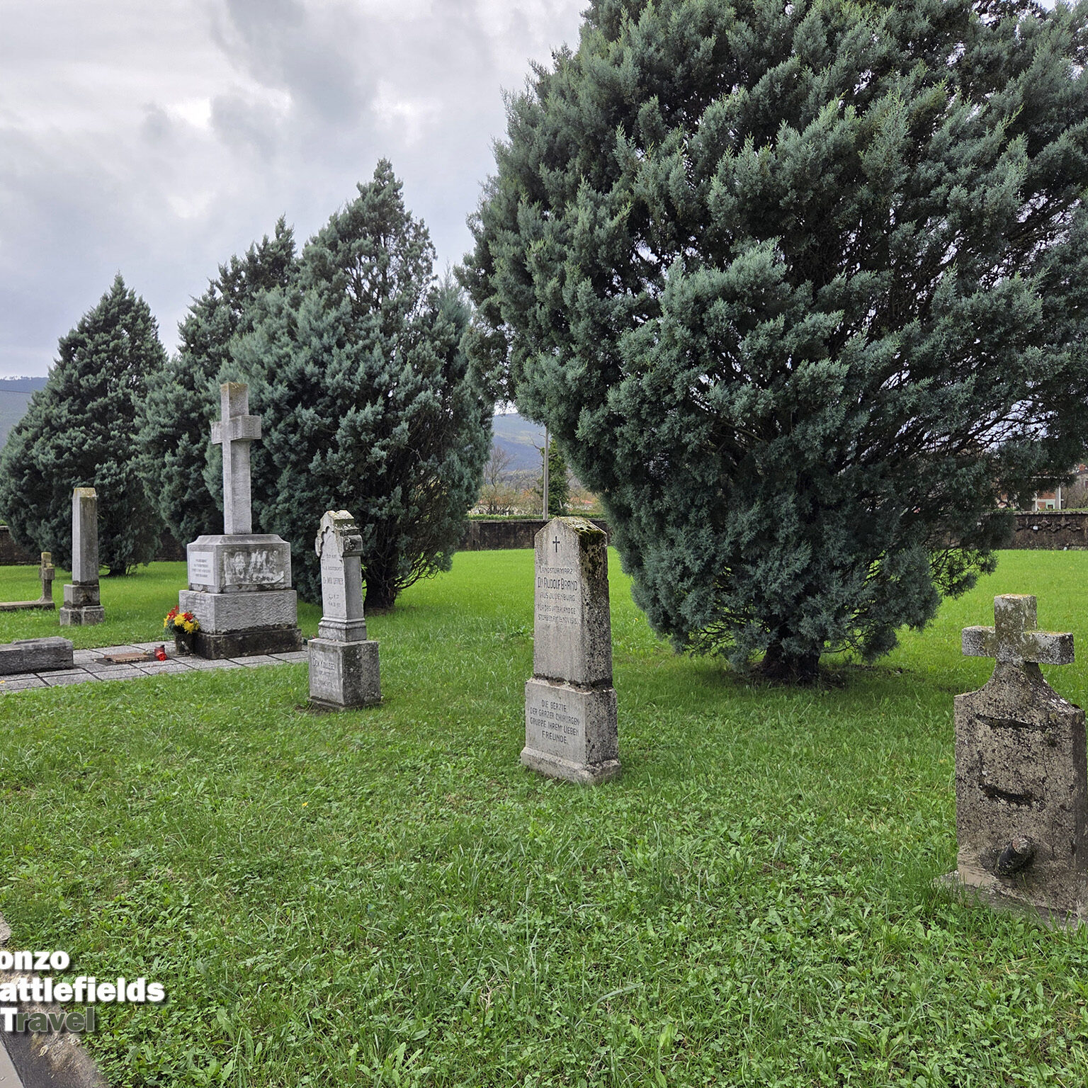 Most of the cemetery is now grassed over, with only a few gravestones preserved, including the central monument with a dedication to the fallen soldiers: