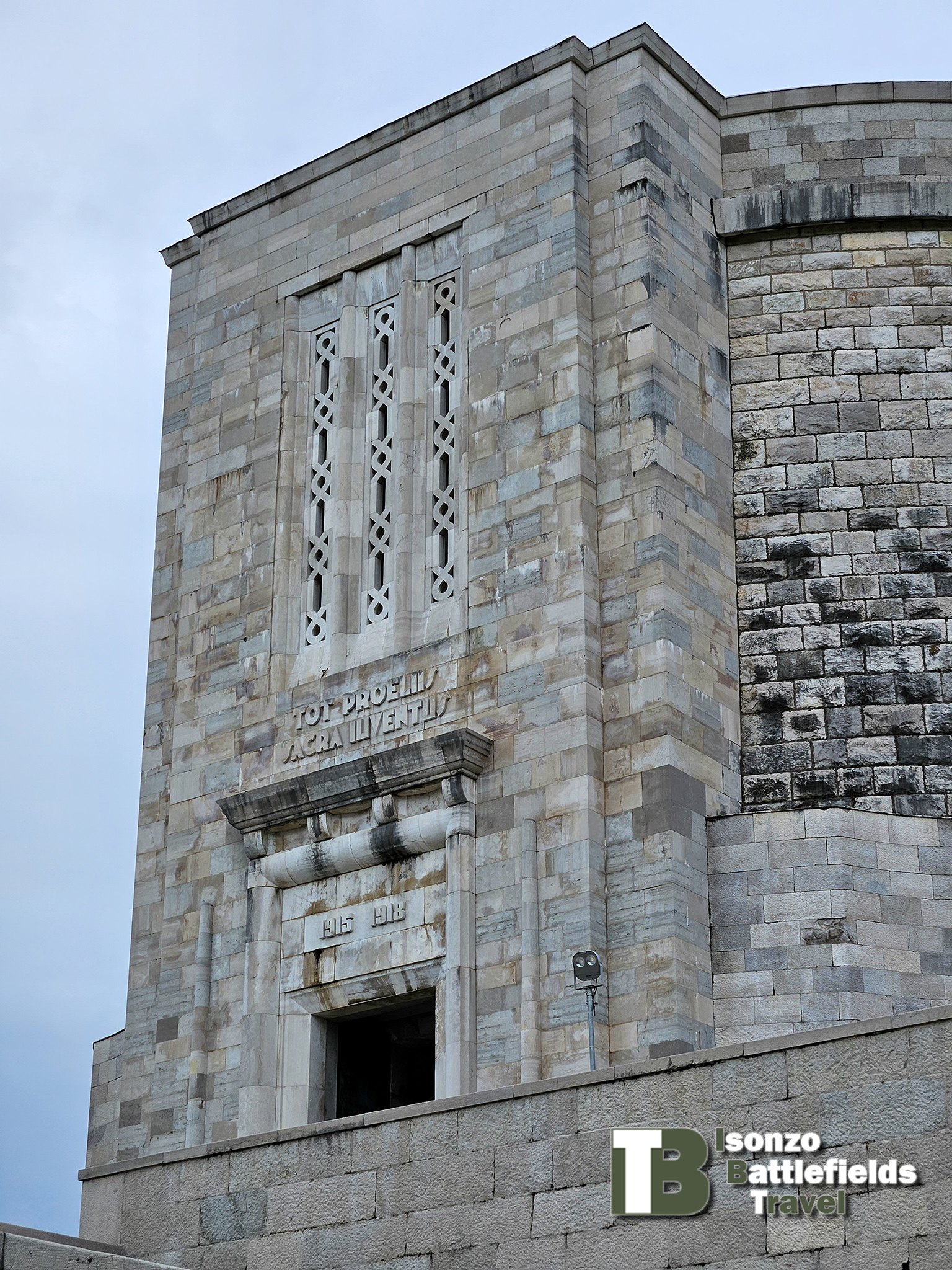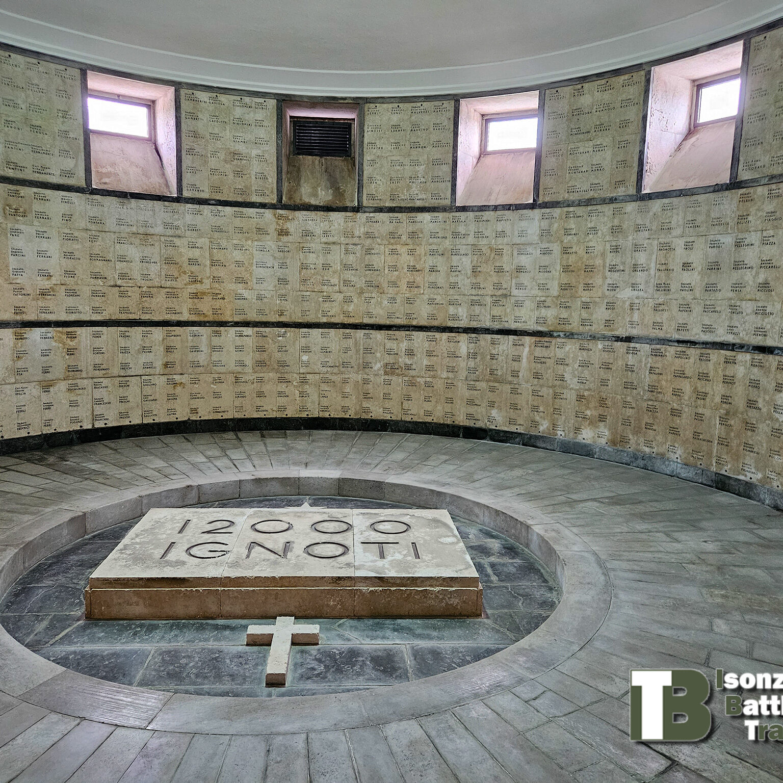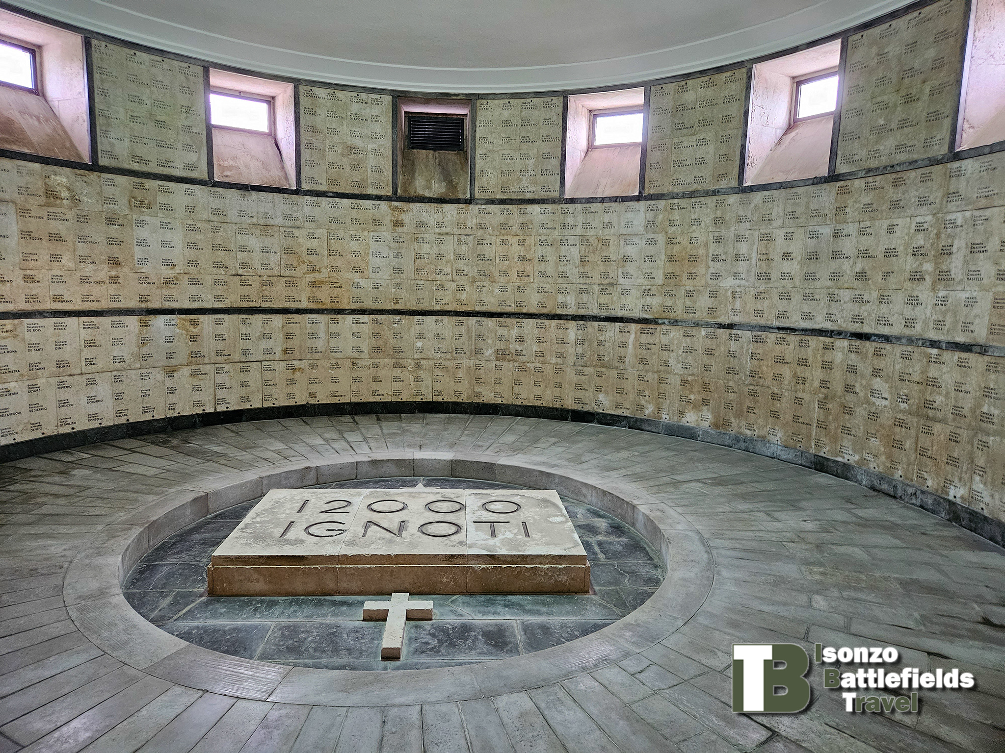 The Ossuary lies on a triangular area and includes four towers, one for each vertex of the complex plus a central tower. Inside each tower are the burial niches of the fallen soldiers, all along the walls, for a total of around 20 thousand names, including 138 Austro-Hungarian soldiers. The remaining 37 thousand unknown soldiers (including 539 foreigners) are instead buried inside three large ossuaries in the middle of the lateral towers.