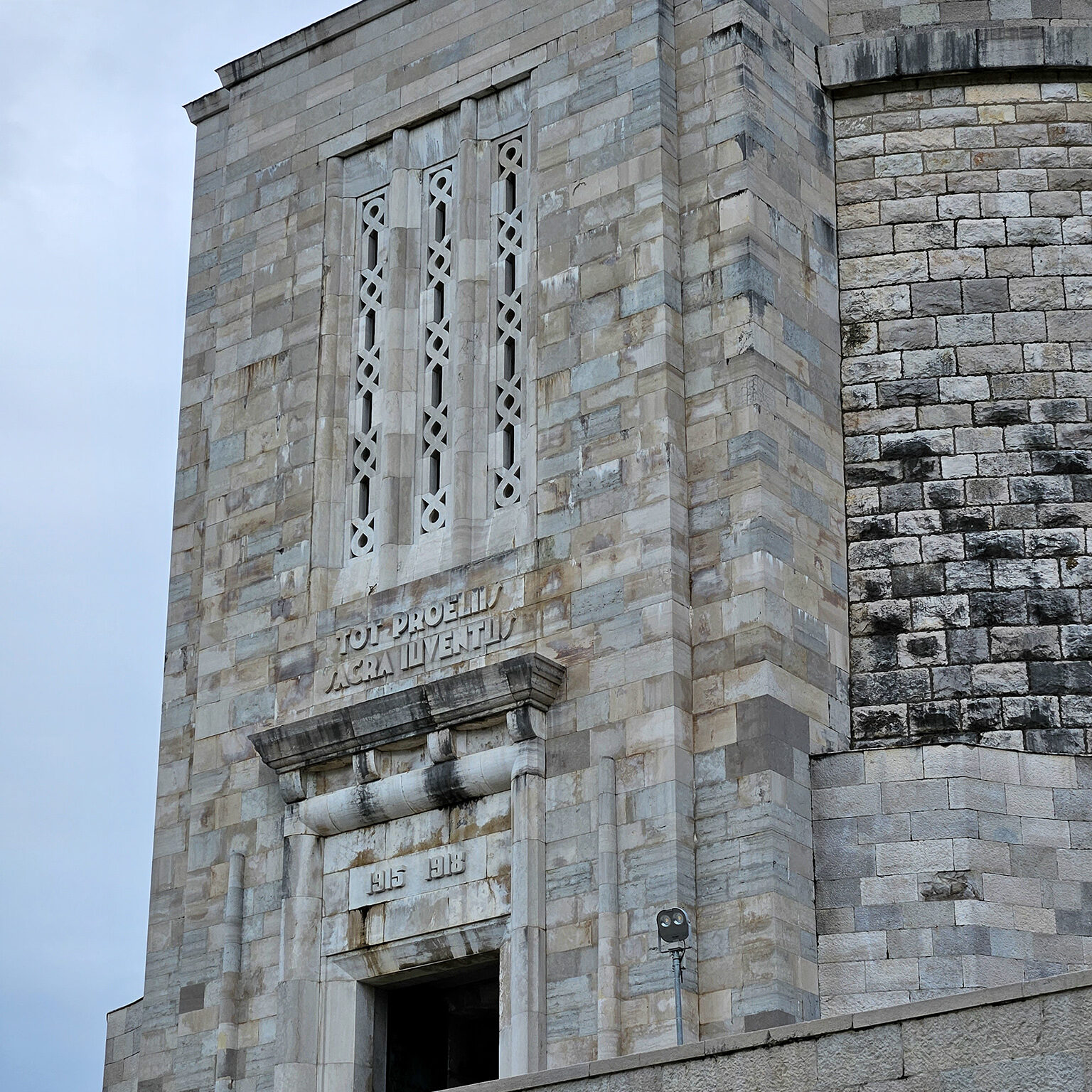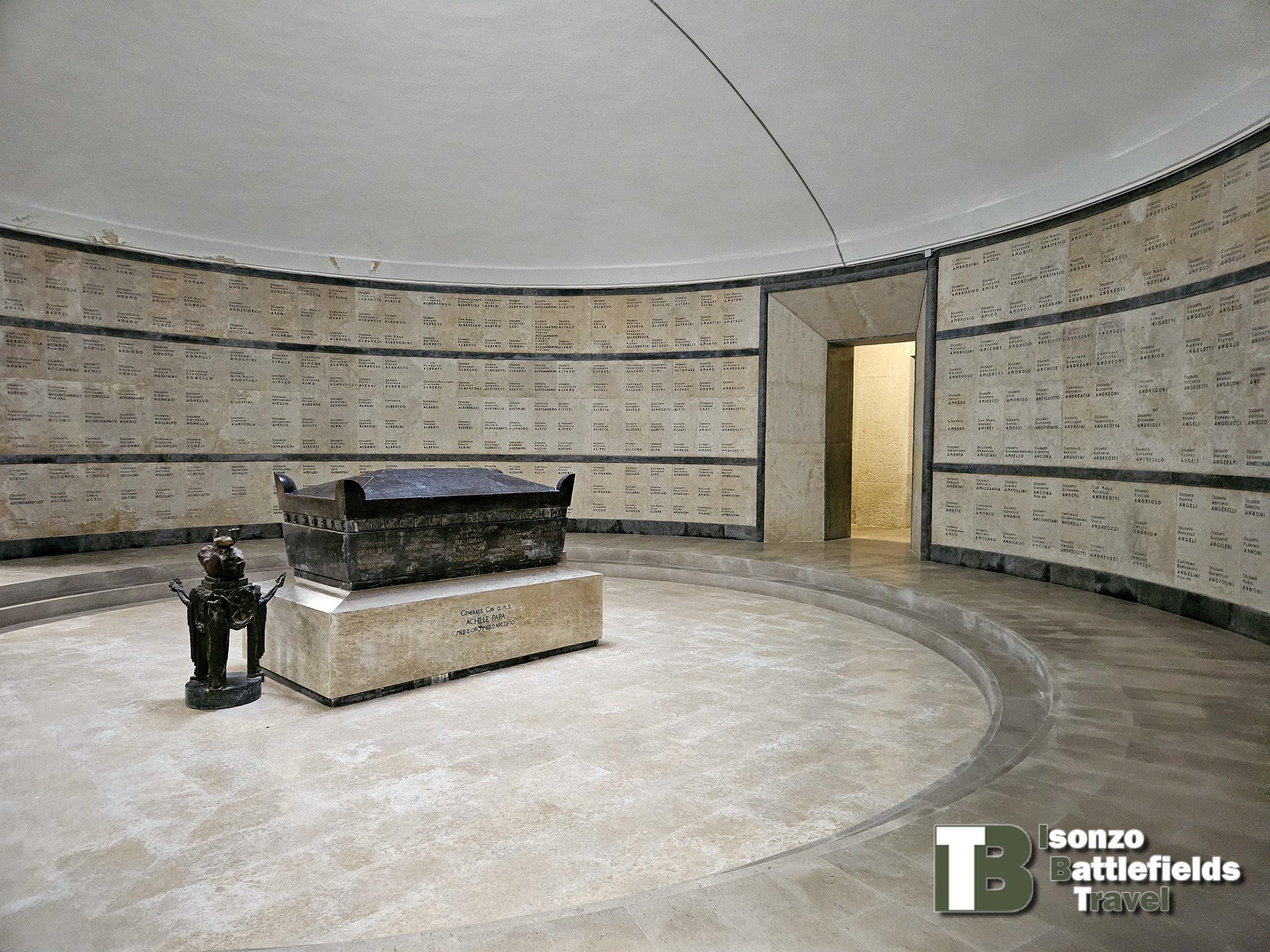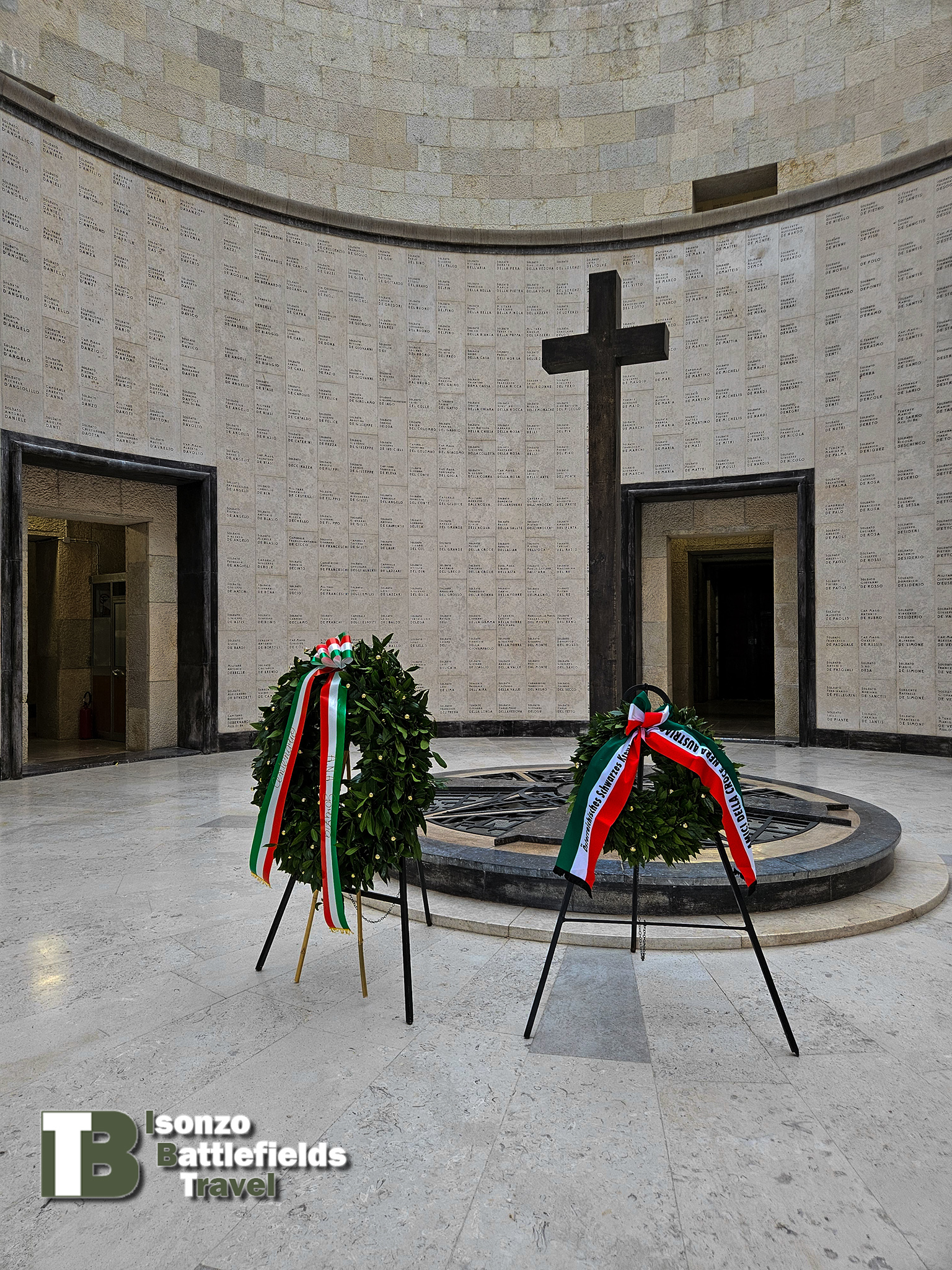 The Ossuary lies on a triangular area and includes four towers, one for each vertex of the complex plus a central tower. Inside each tower are the burial niches of the fallen soldiers, all along the walls, for a total of around 20 thousand names, including 138 Austro-Hungarian soldiers. The remaining 37 thousand unknown soldiers (including 539 foreigners) are instead buried inside three large ossuaries in the middle of the lateral towers.